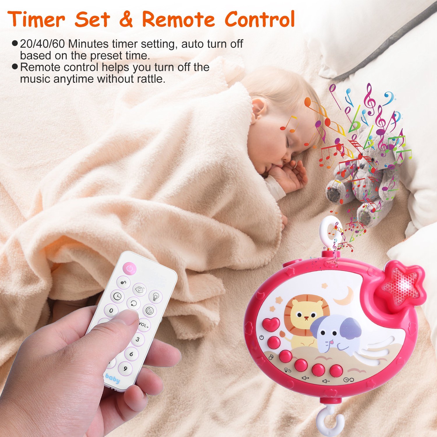 *Quiet Remote Control*:The remote can control all the functions in music box. After your baby fall asleep,you can use the remote to turn off the mobile. All is going on quietly and will not bother your little baby.